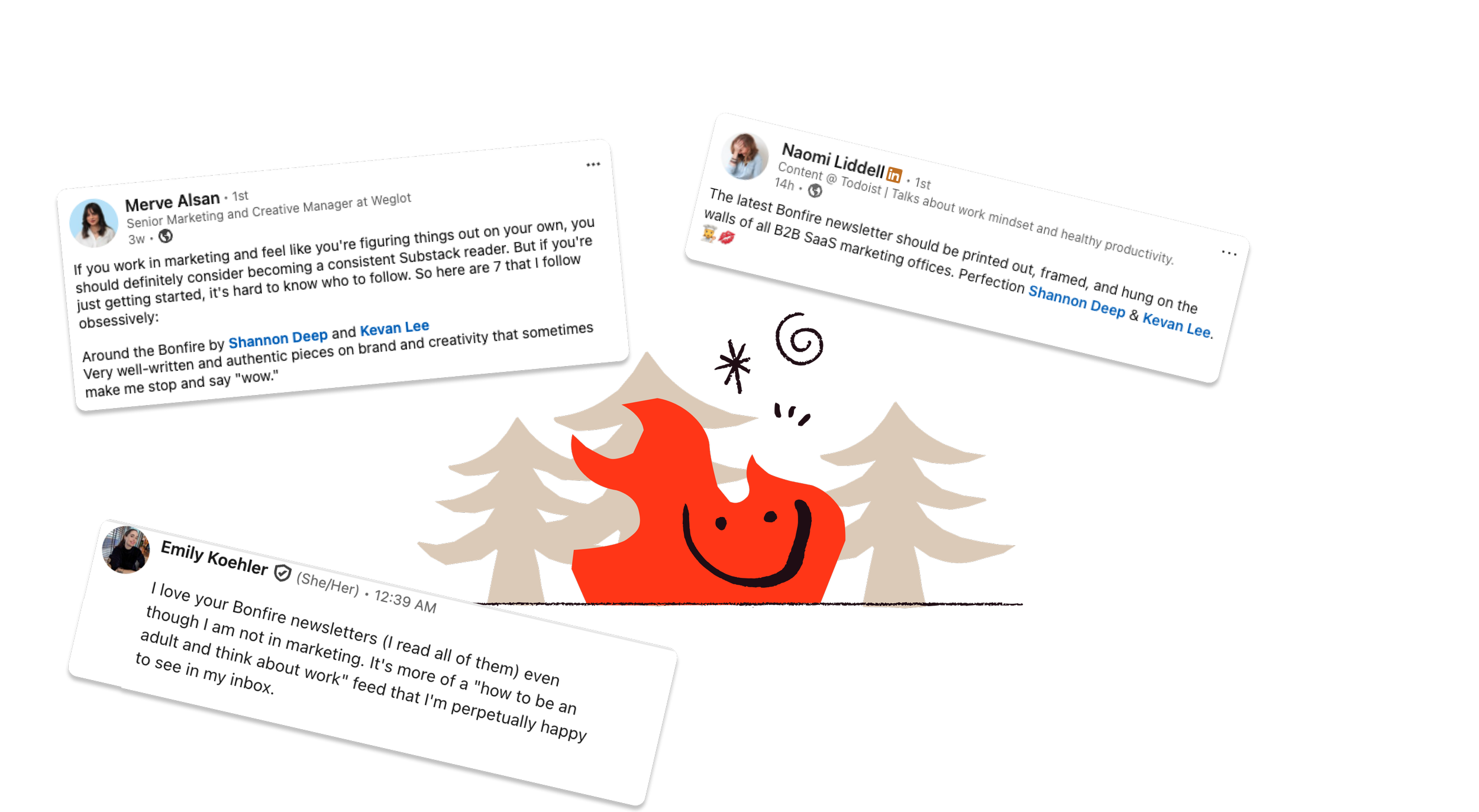 Our newsletter, Around the Bonfire, is where you can connect with us every week. Free insights and musings on our experience as in-house marketers turned agency owners who think a lot about creativity, our relationship to work, and how all of that impacts our identitiesβright to your inbox.